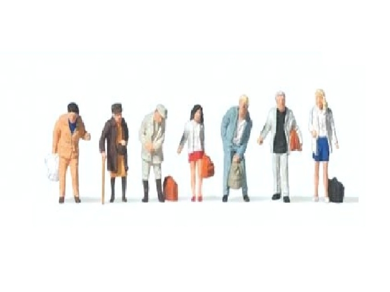 Set de sept voyageurs avec bagages à l'échelle 1 : 160 ème. Personnages et accessoires de la marque Preiser, référence PR79126.