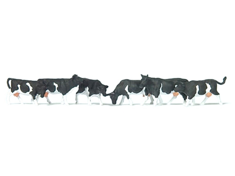Set de six vaches de couleur noire à l'échelle 1 : 160 ème. Figurines de la marque Preiser, référence PR79228.